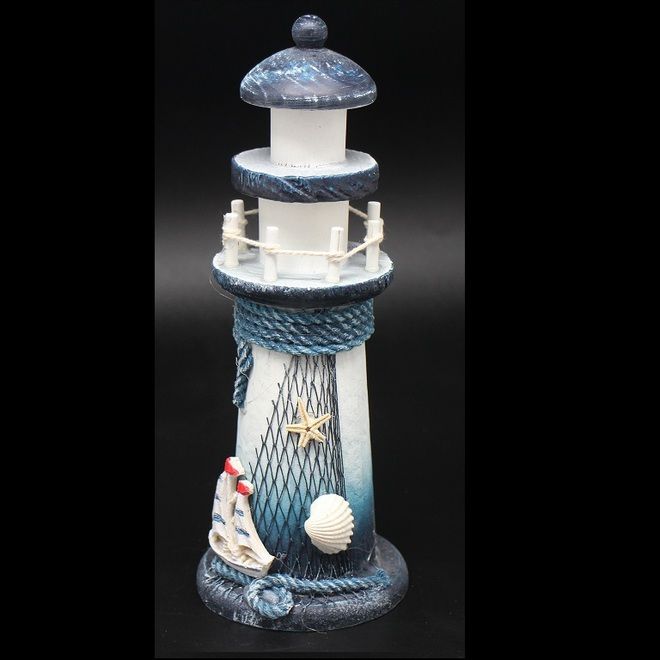FARO DE MADERA BLANCO Y AZUL DE 21 CM DE ALTURA CON RED Y CUERDA BARCO, ESTRELLA Y CONCHA